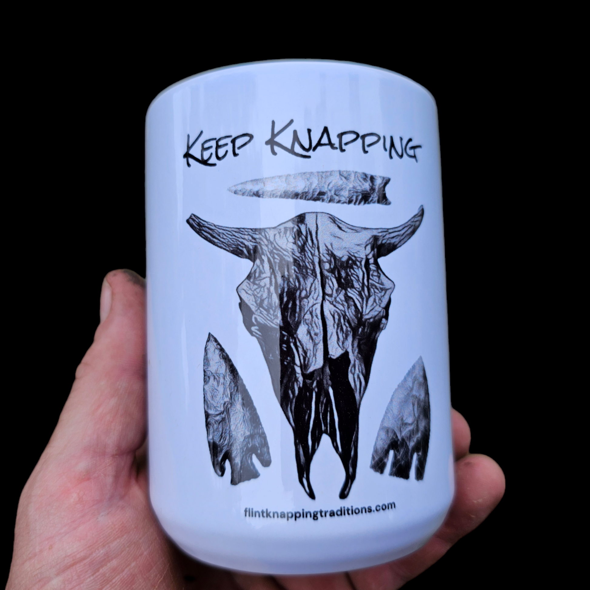 These flintknapping mugs were designed by yours truly and feature three points that I knapped on video along with my bison skull that was recovered from the Arkansas river last year. The mugs are 15oz.