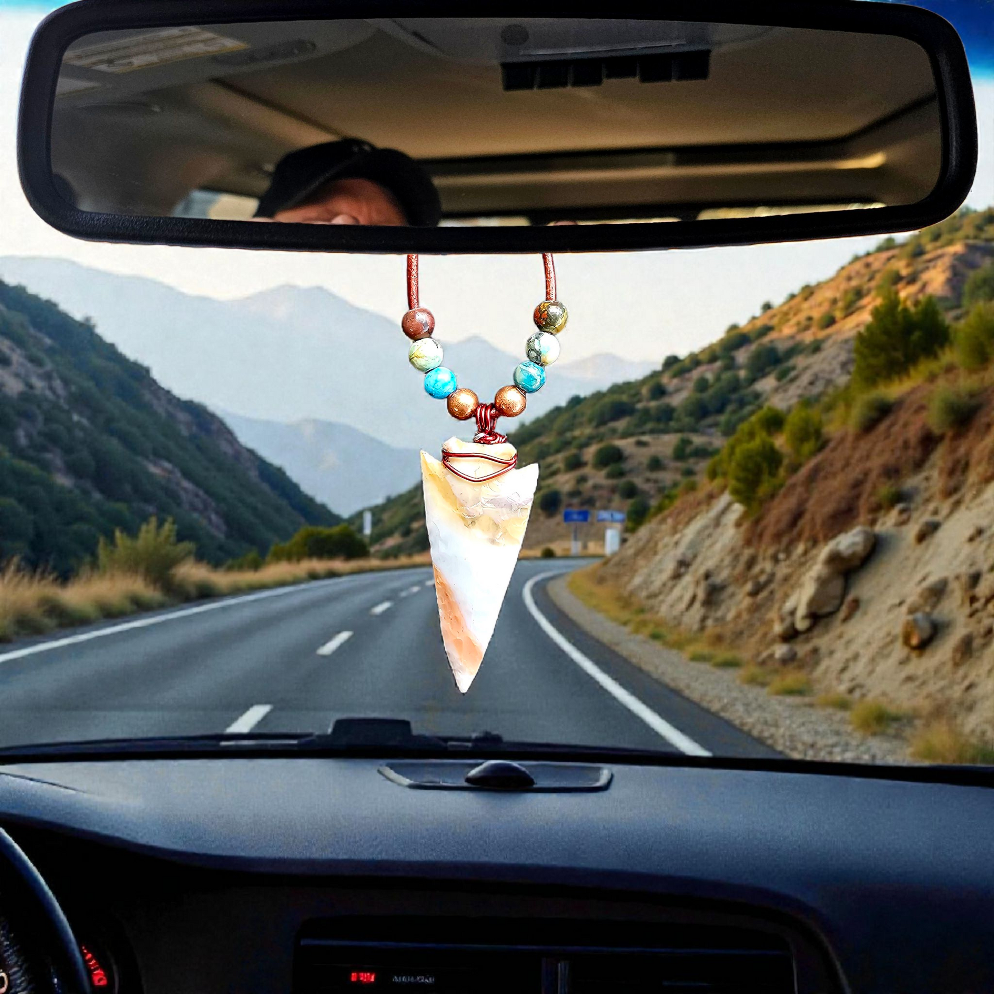 This is a modern Flint Ridge point pendant that can either be worn around the neck or shorten the leather cord and hang it from the rear view mirror. Total arrowhead length is 1 3/4"