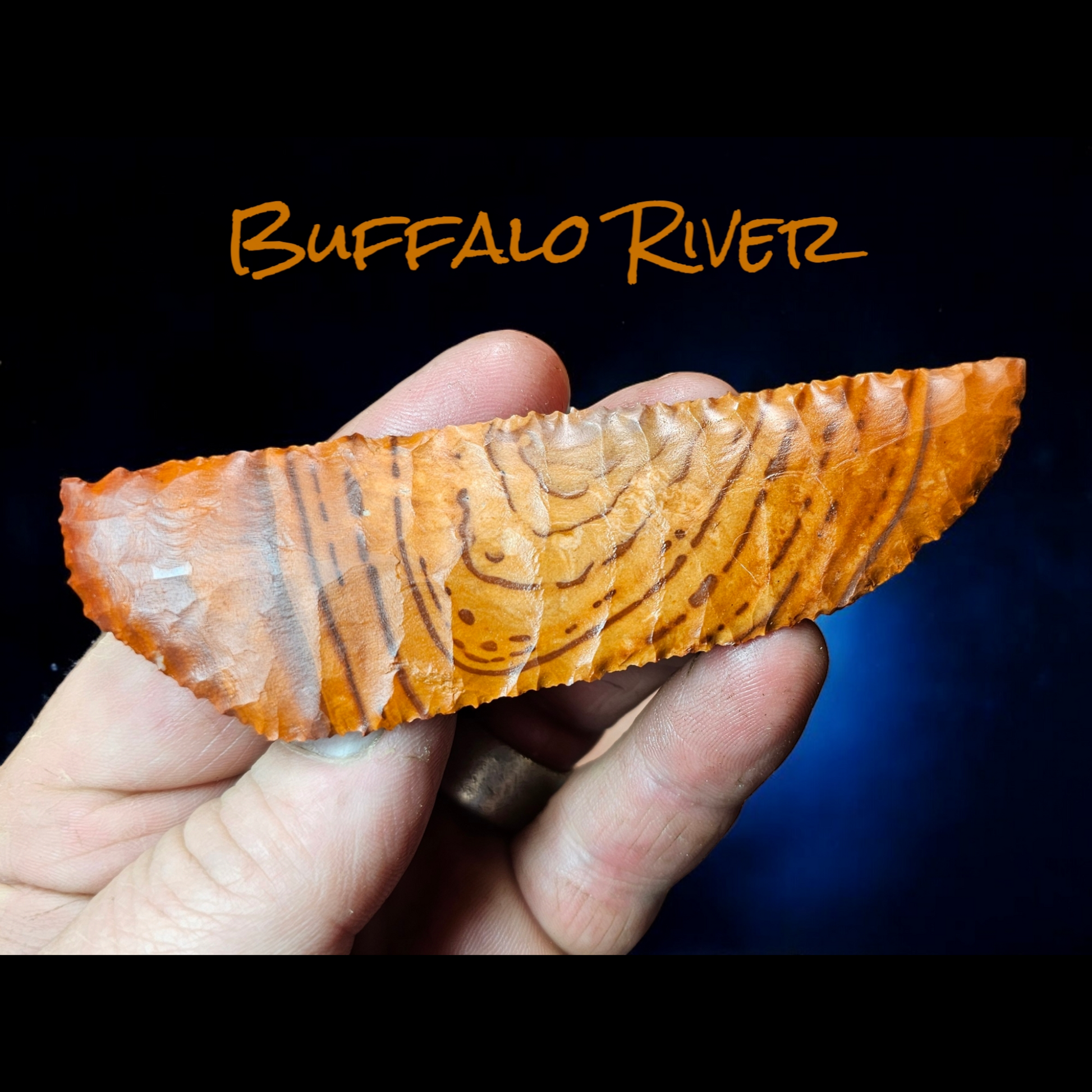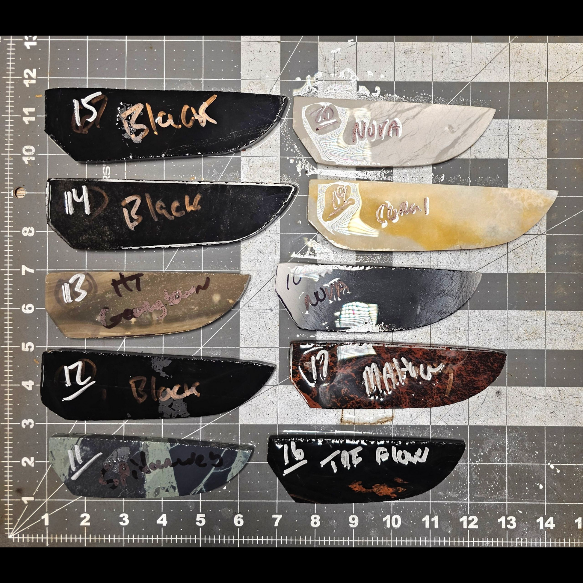These knife blade preforms are one of several new point specific preforms we are making available. The preforms are 5/16 to 3/8" thick and ready to knapp. There is a video on my YouTube channel Danny Collins Lithics & Leather showing the point in the listening being knapped. Photo two is the key for the different material types.