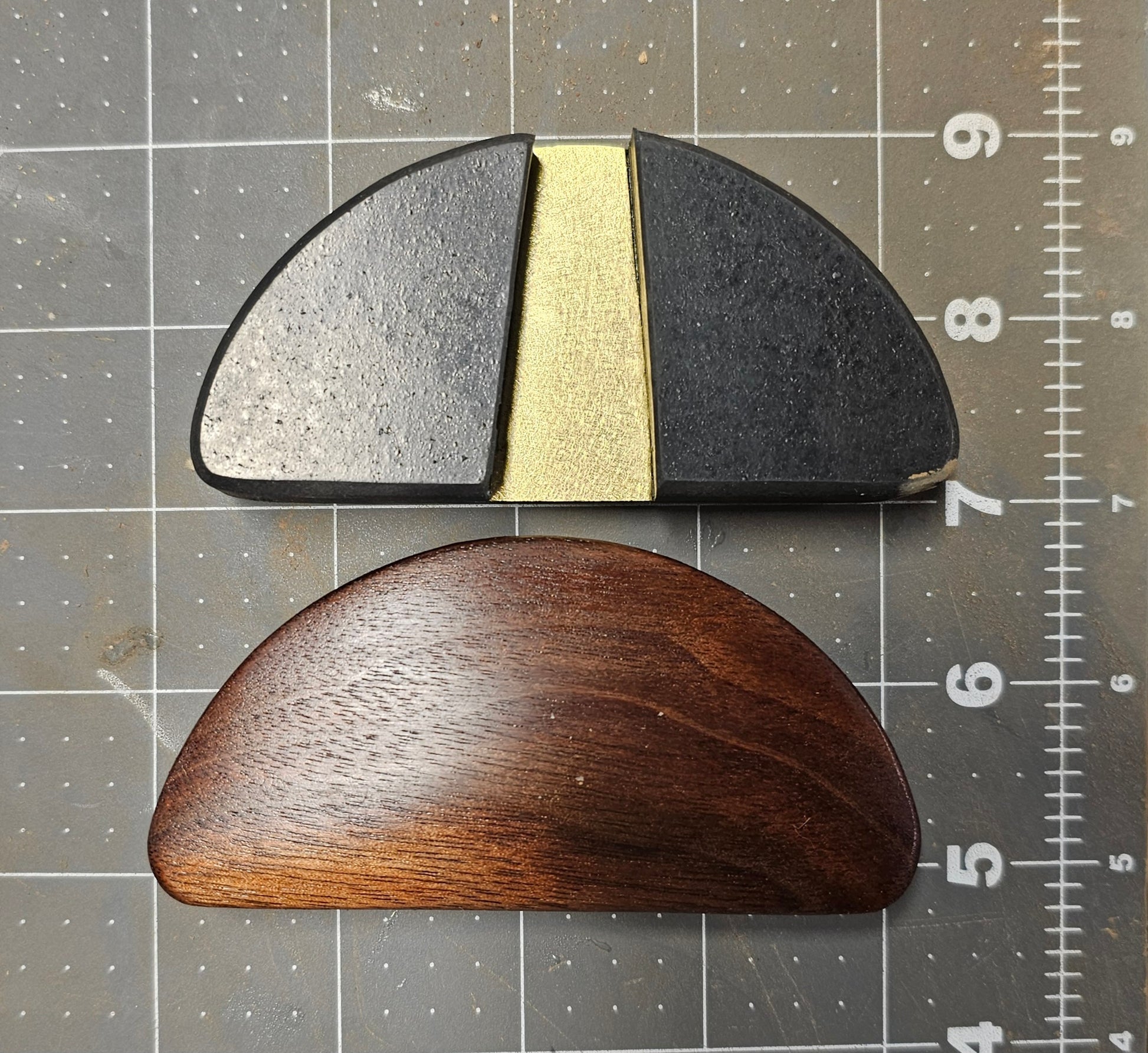 This beautiful black sloted nlack walnut Half moon pad is 4 × 1 7/8 x 3/4 and has a steel reinforced flake channel.