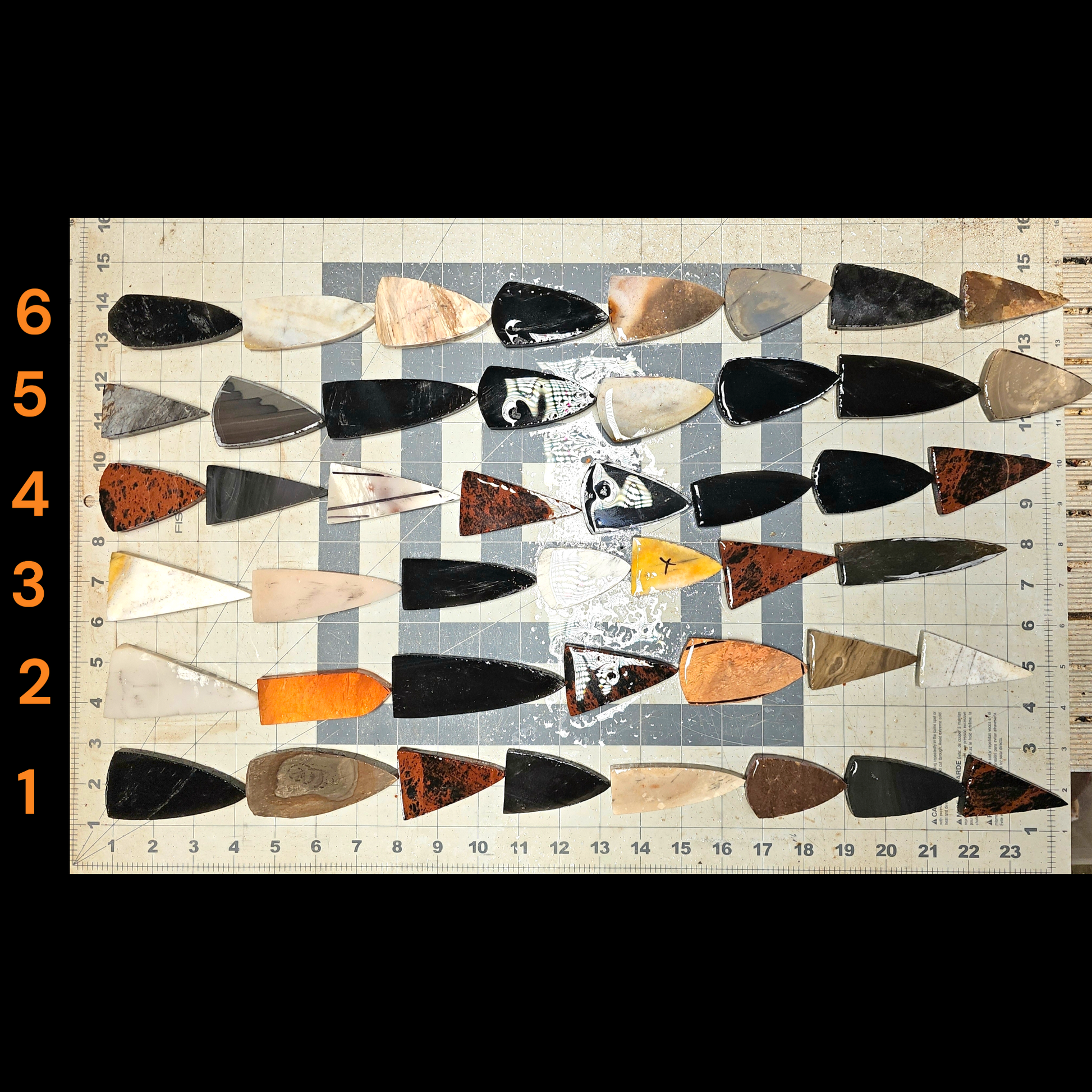 These mix material preform groups are a great way to knapp a variety of great materials and shapes. The preforms are 5/16 to 3/8" thick and ready to knapp. There over 22 inches of material in each row and there is several videos on my YouTube channel Danny Collins Lithics & Leather showing knapping these point specific preforms.