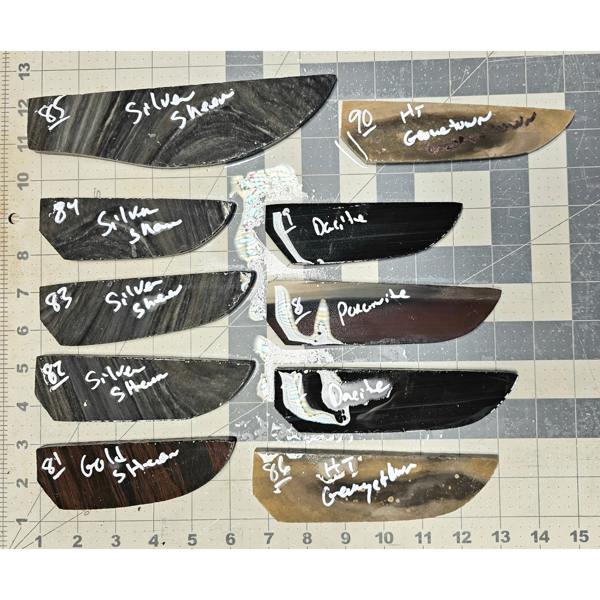 These knife blade preforms are one of several new point specific preforms we are making available. The preforms are 5/16 to 3/8" thick and ready to knapp. There is a video on my YouTube channel Danny Collins Lithics & Leather showing the point in the listening being knapped. Photo two is the key for the different material types.