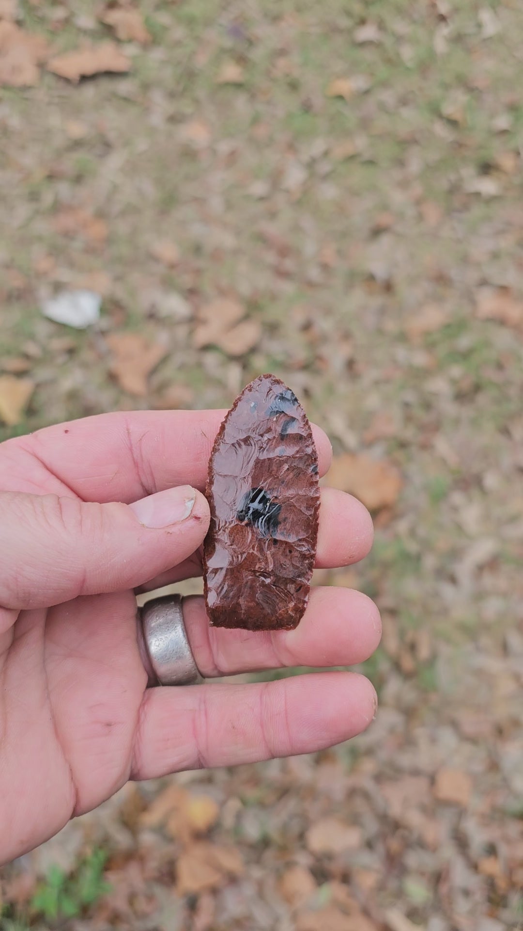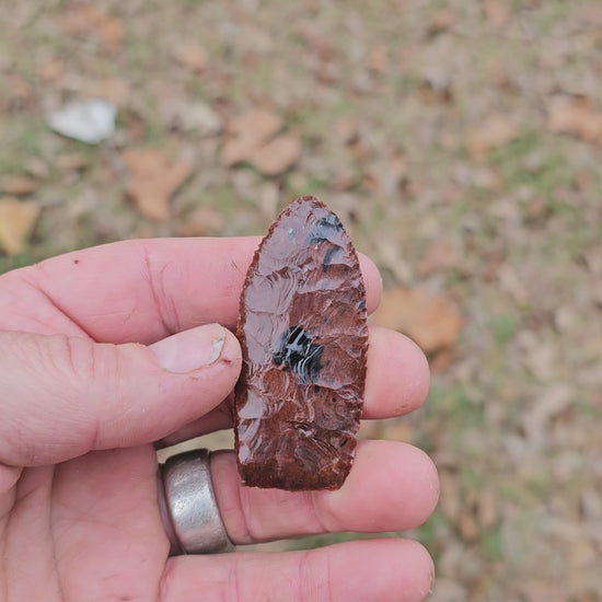 This is a modern spear point / arrowhead that was knapped by yours truly on video. Mahogany Obsidian comes from several places in the world but this particular piece came from Glass Buttes Oregon. Obsidian was widely used by ancient people and was almost exclusively used by some South American tribes.