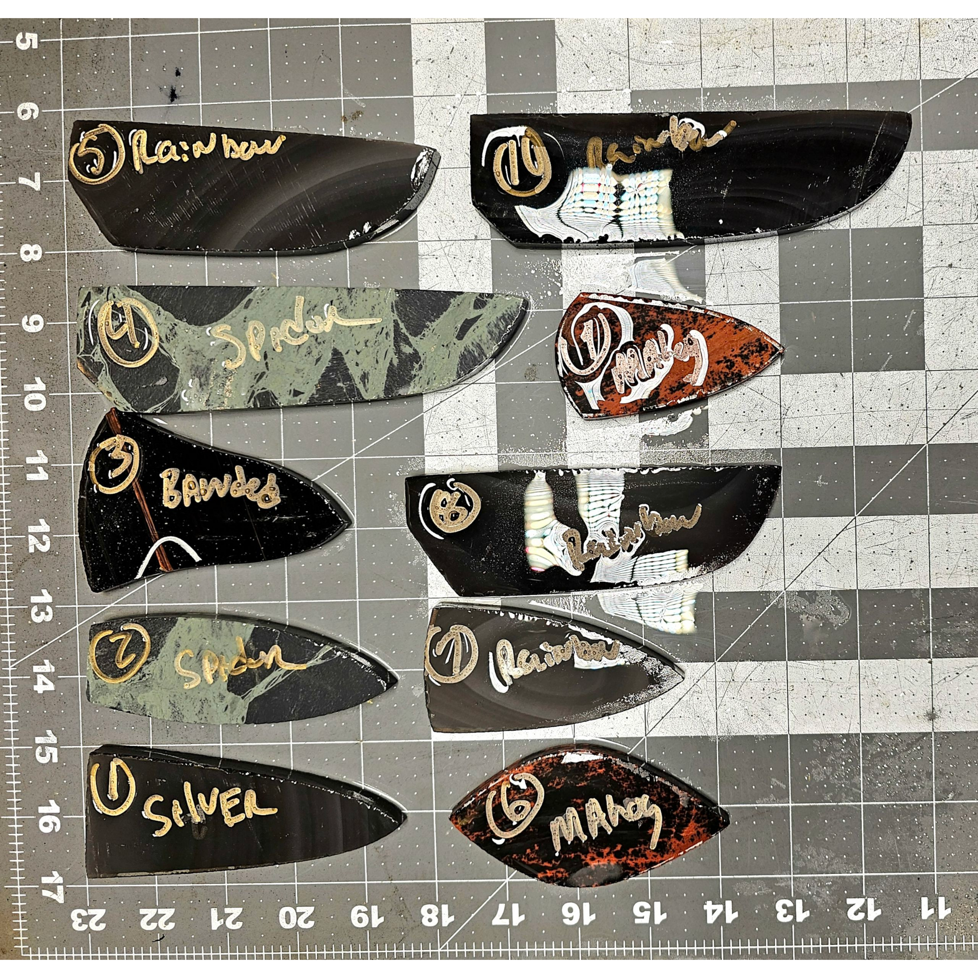 These are various verity obsidian preforms and are 5/16 to 3/8" thick and ready to knapp.