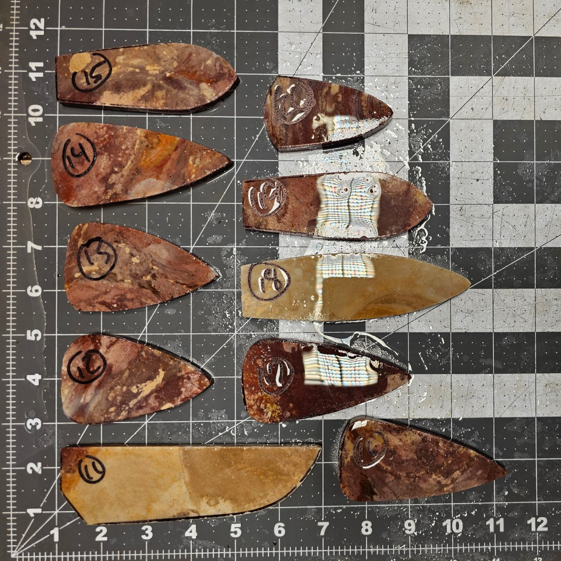 These Alibates preforms will be availablein in very limited numbers. As you probably know due to the rarity of good solid knappable stone and the fact that the main sorce is now a national park Alibates is one of more costly knapping materials but it's also one of the prettiest.