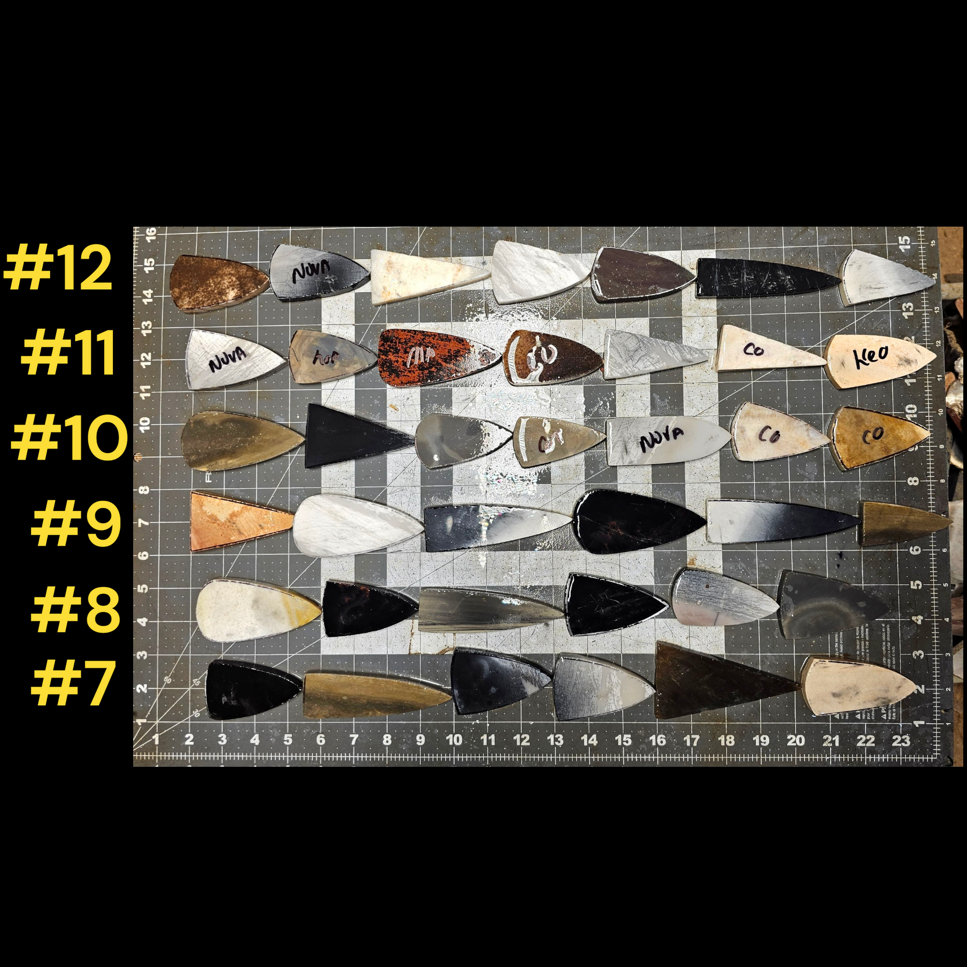 These mix material preform groups are a great way to knapp a variety of great materials and shapes. The preforms are 5/16 to 3/8" thick and ready to knapp. There over 22 inches of material in each row and there is several videos on my YouTube channel Danny Collins Lithics & Leather showing knapping these point specific preforms.